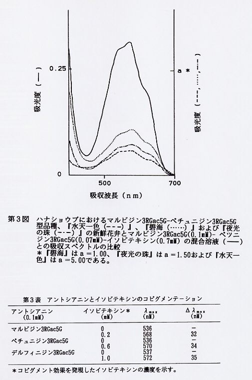 次に、第3図に示したようにマルビジン3RGac5G-ペチュニジン3RGac5Gの混合溶液の吸収スペクトルは、マルビジン3RGac5G-ペチュニジン3RGac5G型の青紫品種『水天一色』、『碧海』および『夜光の珠』の新鮮花弁における吸収スペクトルとよく類似していた、以上のことから、これらの品種における花弁の青色化は主としてマルビジン3RGac5Gおよびペチュニジン3RGac5Gとイソビテキシンのコピグメンテーションによるものと結論づけられる。